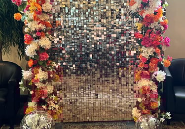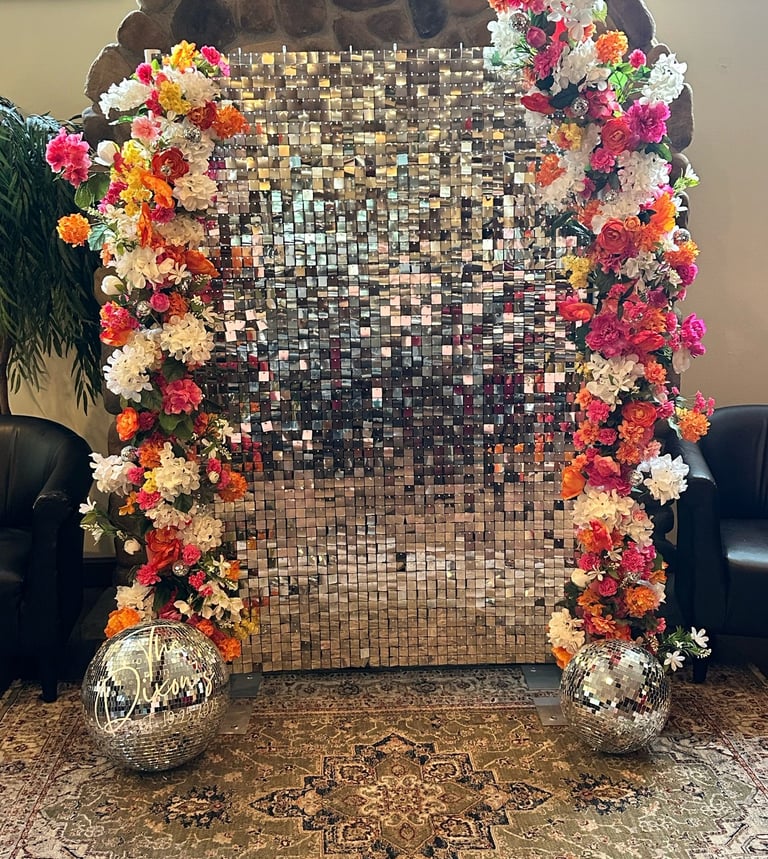 Complete your vibe by having a backdrop to create fun memorable moments. Our sequin wall is always a fun option. We also offer boxwood and red floral.