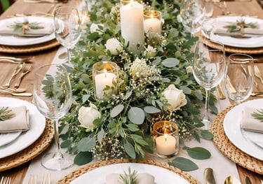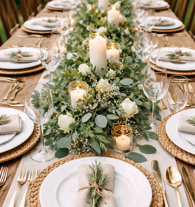 Warm up your decor with some greenery on on the tables or fireplace. Easy way to cozy up the vibe.